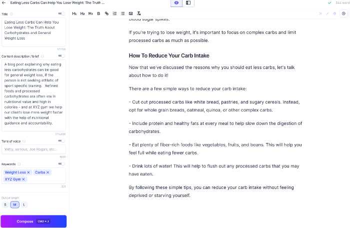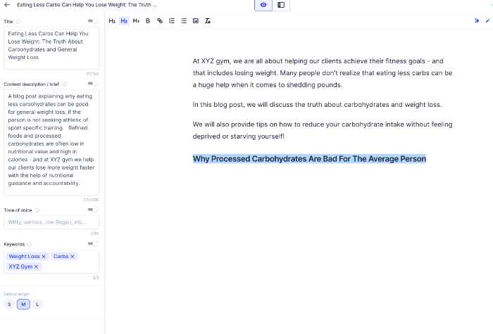 As you can see in the screenshot above, it came up with about 5 options for me. I ran with the title "Eating Less Carbs Can Help You Lose Weight: The Truth About Carbohydrates and General Weight Loss"
