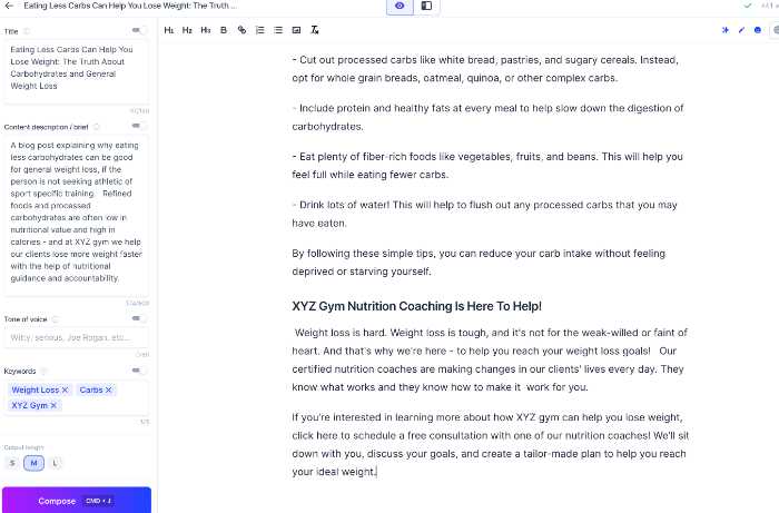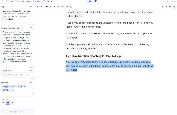 For the next topic, I make sure to write it, since I know exactly where I want it to go - I need it to tie back to the nutrition coaching we do at XYZ Gym. So I manually type "XYZ Gym Nutrition Coaching Is Here To Help!"